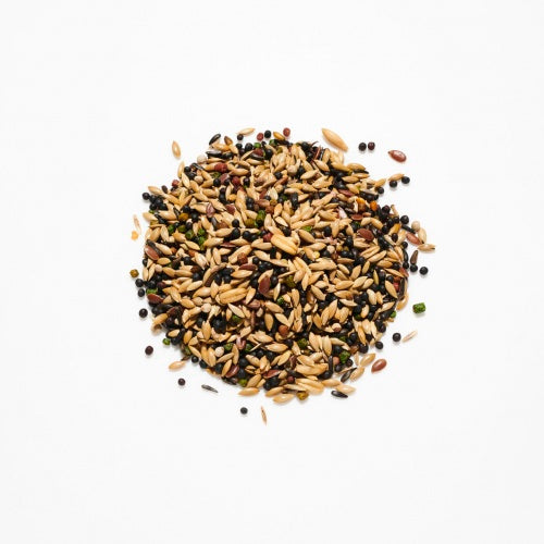 Canary seed, black rapeseed, canary Nutribird pellets, nigerseed, naked oats, linseed, fine oystershell grit, heathseed mix (carrot, radish, cress, grass, spinach, turnip, onion, blue maw, rapeseed, perilla brown, red & white millet, nigerseed), perilla seed, oil dressing.