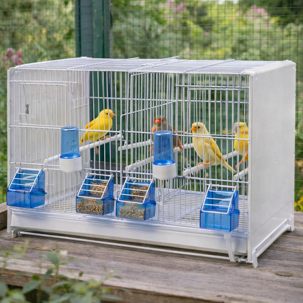 Premium double breeding cage. Ideal for canaries, finches, and similar small birds. Includes accessories.