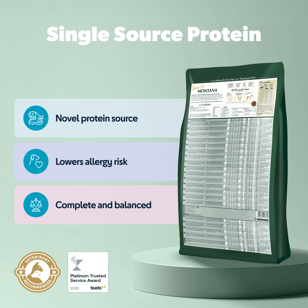 Happy Dog Sensible Montana (Horse) is a premium, gentle dry dog food specially developed for adult dogs with food sensitivities, allergies, or delicate digestion. Made in Germany and crafted with a single source of animal protein, this formula uses high-quality horse meat as a novel protein to help reduce the risk of food intolerances.