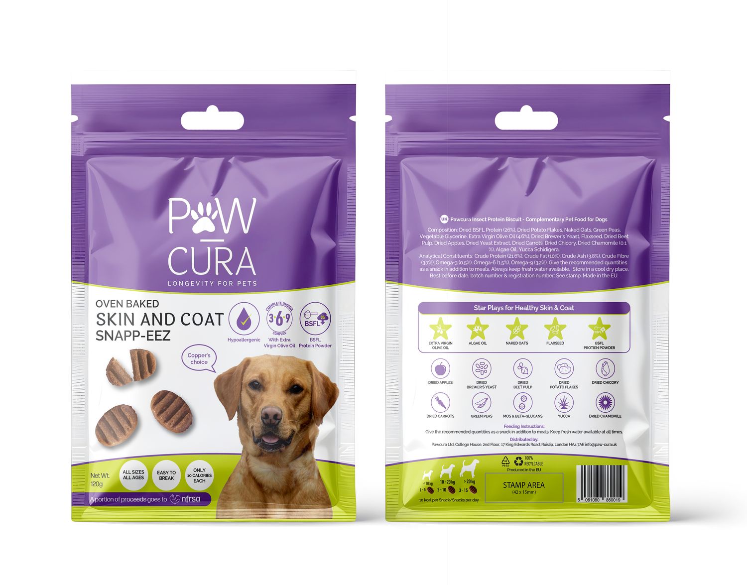 Make your dog shine inside and out with Paw-Cura Skin & Coat Snapp-Eez – the premium hypoallergenic dog treats made with Black Soldier Fly Larvae (BSFL) protein and a unique blend of skin-supporting superfoods. Oven-baked to perfection and packed with natural, clean ingredients, these tasty biscuits are ideal for dogs with sensitive skin, food intolerances, or those on a grain-free diet.