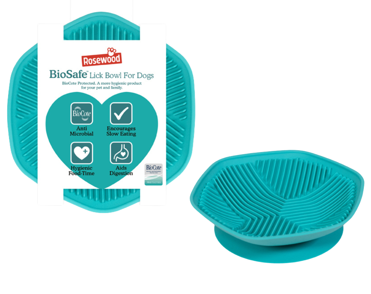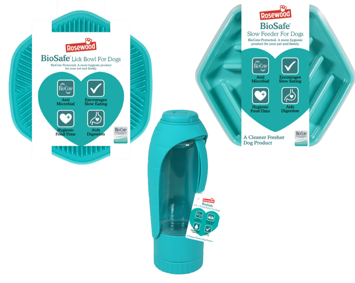 The Rosewood Biosafe Range offers a collection of cutting-edge pet care products designed with your pet's well-being in mind. Each product in this range is crafted with advanced Biocote antimicrobial technology, providing a hygienic and safe experience for your furry friend. The range includes three essential items: the Biosafe Slow Feeder Bowl, Biosafe Pet Travel Bottle, and Biosafe Lick Bowl—all presented in a vibrant Biocote blue color.