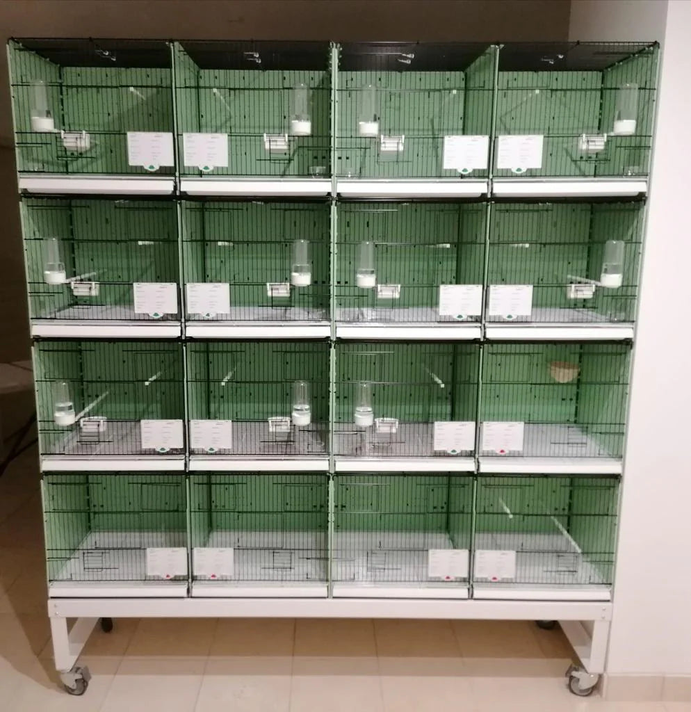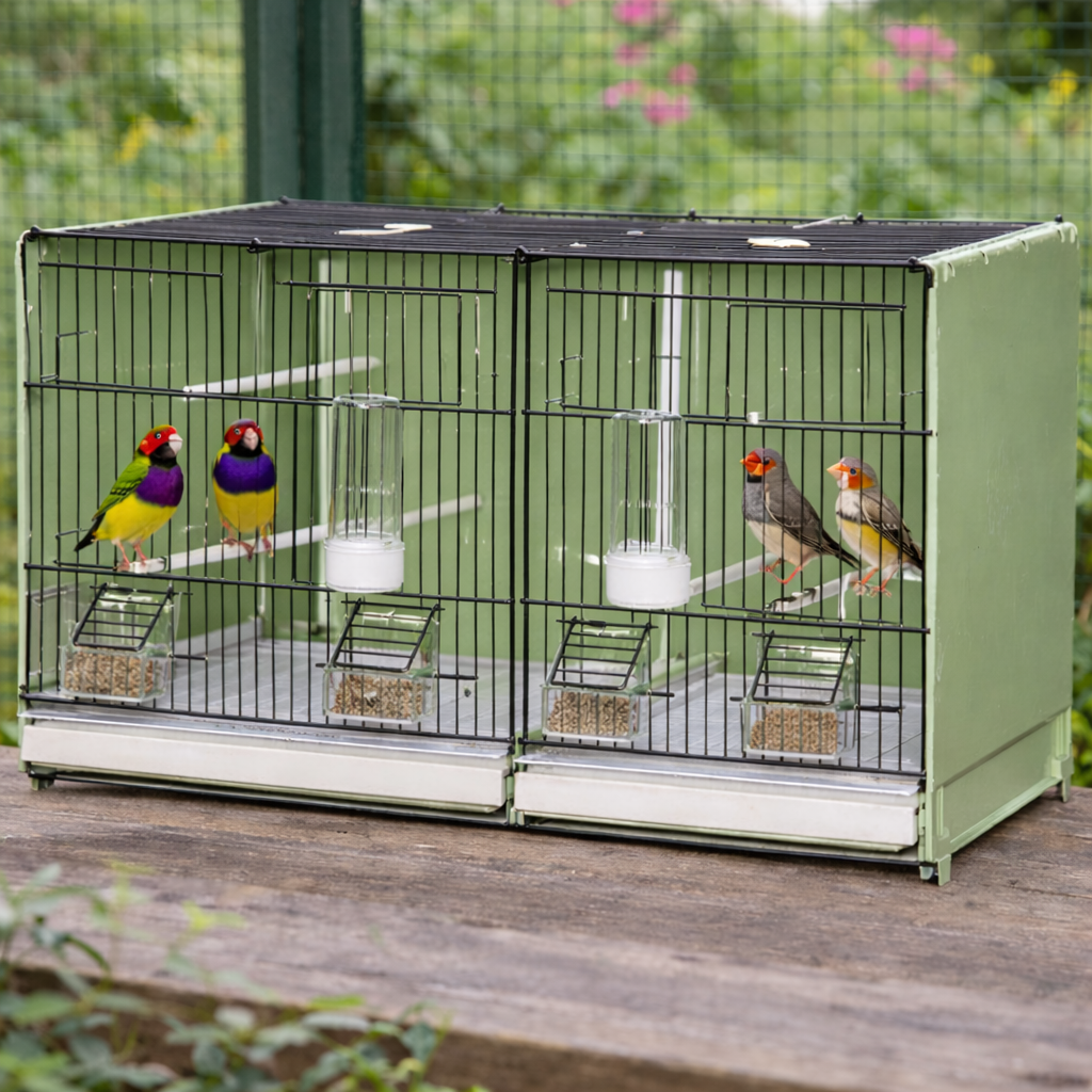 Black wire breeding cage with green plastic sides, includes accessories. Ideal for canaries, finches, budgies, and similar small birds.