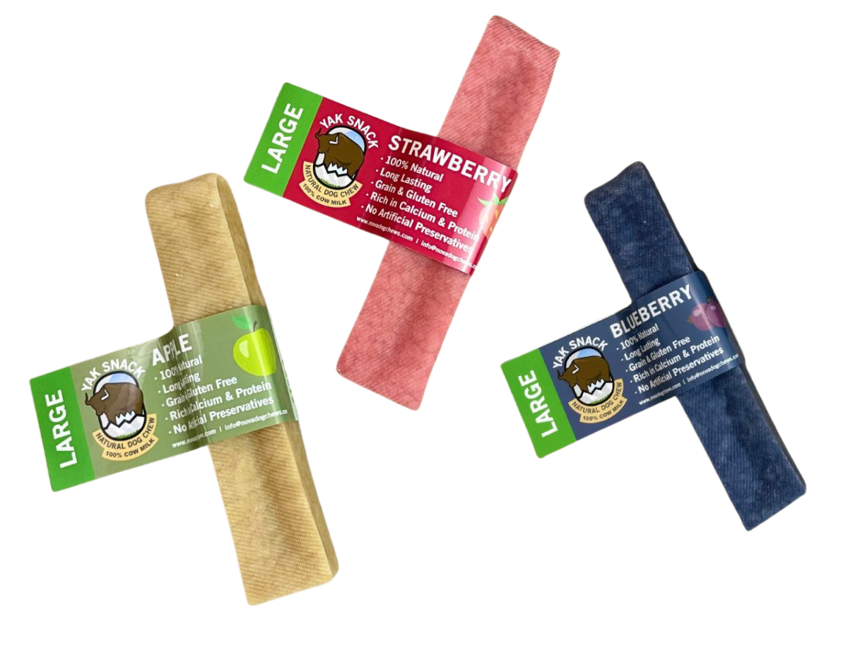 Available in four irresistible varieties—Blueberry, Apple, Strawberry, and Peanut Butter—each chew offers a satisfying, durable texture while remaining gentler than antlers and far tougher than most standard chews. Naturally rich in protein and calcium, these flavoursome Yak Snacks support healthy teeth, strong bones, and overall vitality.